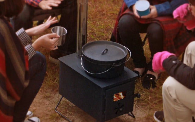 ストーブ内の空気量を調整できる換気口と、炎を眺められる耐熱ガラス窓つき。設置は本体の脚を展開し、煙突を差し込むだけで完了する。本体と付属品は、すべて専用キャリーバッグに収納できる。天板を外して焚き火や直火料理をしたり、炭を起こしてBBQをしたりと年中通して使用可能だ。重量約12.5kg。4万円(税抜き)。