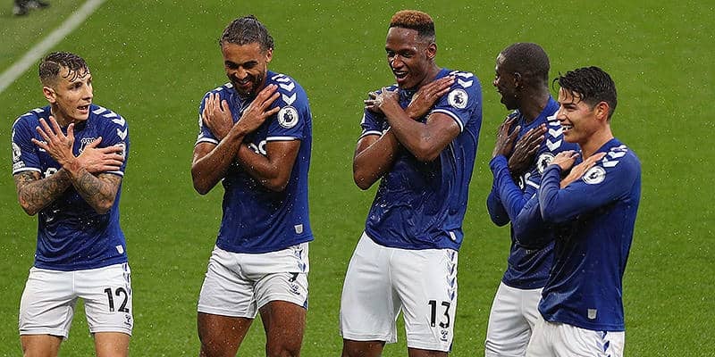 リシャルリソンの負傷に守護神のミスと嫌な流れが重なるエバートンだが、前半ラストプレーで勝ち越す。相手陣内右サイド深くで得たFKの場面でキッカーのハメス・ロドリゲスが柔らかなクロスをゴール前に入れると、コロンビア代表の同僚である長身DFミナが打点の高いヘディングシュートを叩き込んだ。