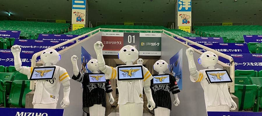 2日から4日に行われた日本ハムとの3連戦では「ロボット応援大戦」と題して、日本ハムが札幌ドームで活用するリモート観戦席ロボット「Future Box Seatβ」とコラボし“応援対決”が実現。「Pepper」はファンからの投稿の中から選ばれたダンスの振り付けをアレンジして再現するという“妙技”を披露してファンを驚かせた。