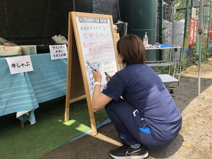 今年は新型コロナウイルス感染症拡大の影響で、開幕は約3か月遅れたものの、無事にイースタン・リーグも開幕し、本稼働しはじめたキッチンカー。葛西氏がメニューボードに記入した「本日のオススメメニュー」を横目に、若獅子たちは「今日はどれにしようかな?」。それぞれが選んだ食事がトレーの上を彩っていく。
