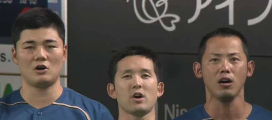 試合前の国歌斉唱に熱い視線が注がれる日本ハム。この日は今季初となる杉谷、清宮、矢野コーチの3人が揃い踏み。出だしから3人が大きく口を開け「君が代」を熱唱する姿を「パーソル パ・リーグTV」も注目。