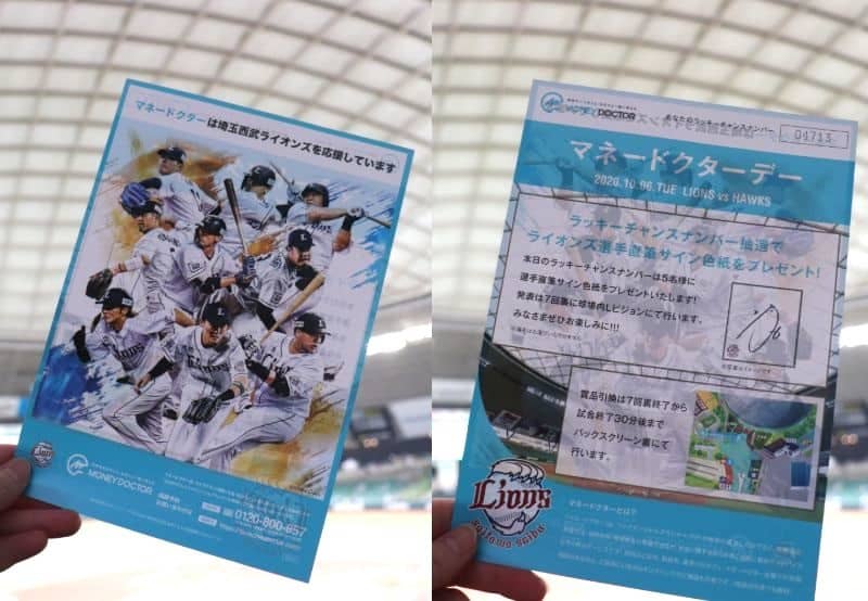 この日(10月6日)は埼玉西武ライオンズとオフィシャルスポンサー契約を締結している株式会社FPパートナーによる「マネードクターデー」を開催。入場ゲートにて、ライオンズの選手の直筆サイン色紙が当たるラッキーチャンスナンバー入りのチラシを受け取る。