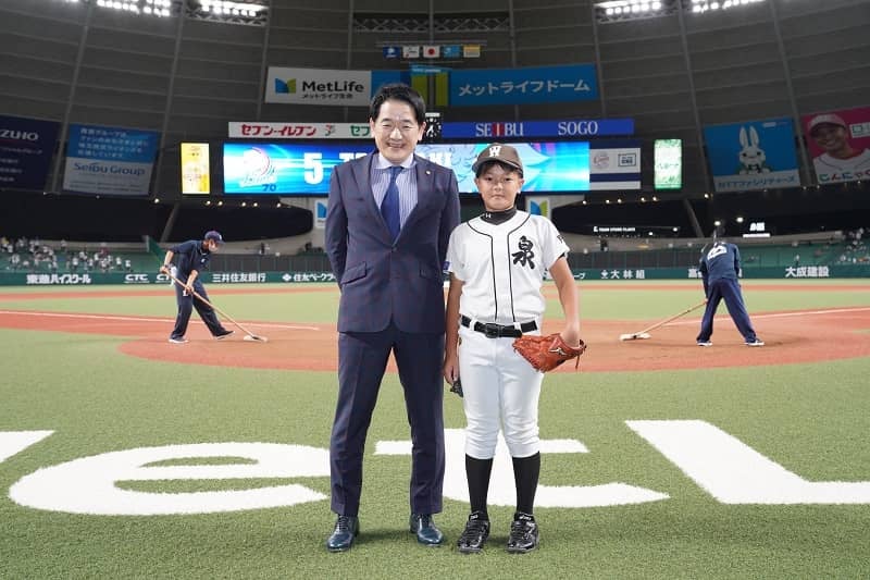 (C)SEIBU Lions / 株式会社FPパートナー代表取締役社長の黒木勉さんと、始球式を務めた鴨田央翔くん