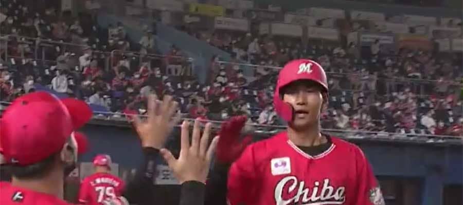 出会い頭に一振りで決めた。楽天の先発は通算143勝の涌井。初球に来た143キロ直球を振り抜くと、力強いアーチを描いた打球は右翼スタンドへ。プロ通算41打席目で記念の一発が飛び出した。この日は真っ赤な「CHIBAユニホーム」を着用した藤原は、堂々とダイヤモンドを回ってベンチで祝福を受けた。