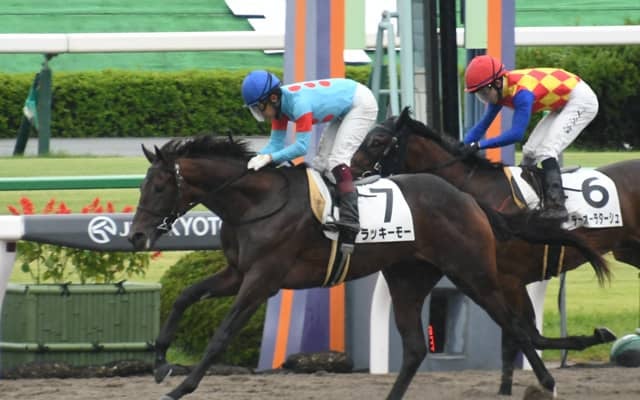 17日、京都競馬場4Rで行われた新馬戦(2歳・ダ1400m・16頭)は、先行集団の後ろでレースを進めた福永祐一騎手騎乗の1番人気ラッキーモー(牡2、栗東・松永幹夫厩舎)が、直線で外から各馬を差し切り、2着の14番人気テーオーラターシュ(牝2、栗東・高柳大輔厩舎)に3/4馬身差をつけ優勝した。勝ちタイムは1分25秒1(重)。