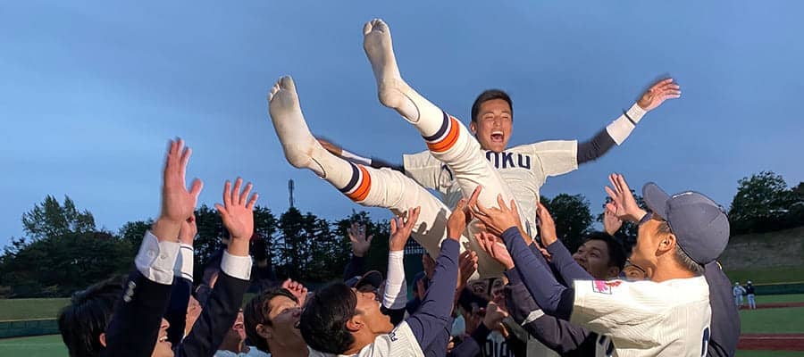 胴上げされる東北福祉大学・元山飛優【写真:高橋昌江】