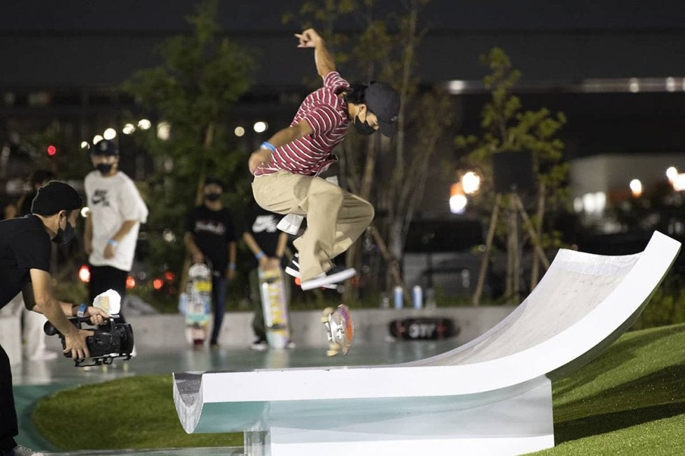 パーク内では並行してスケートボード、3×3のバスケットボールのライブ配信イベントも。スケートボードプラザにはオリンピック候補の呼び声も高い池田大亮選手をはじめ、競技スケートボード&ストリートで活躍する注目選手が終結。紅白チームに分かれて熱い戦いを繰り広げた。難度の高いトリックの応酬で、ギャラリーを釘付けに。