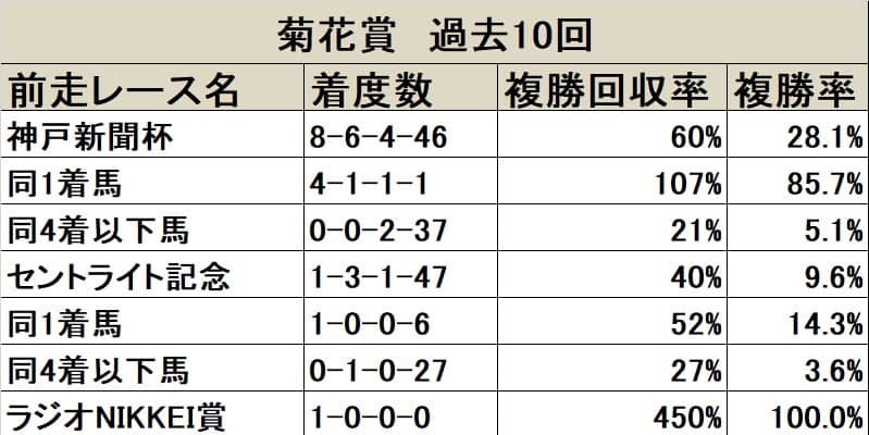 過去10年で神戸新聞杯組が8-6-4-46と8勝を挙げており、同じくトライアルであるセントライト記念の1-3-1-47を圧倒している。さらに神戸新聞杯の1着馬は4-1-1-1、1番人気1着馬は4-0-0-1とさらに信頼度が上がる。今年無敗の三冠達成を狙うコントレイルはこれに当てはまることになるだろう。また、後者のパターンで菊花賞を制した馬にはオルフェーヴル・ゴールドシップ・エピファネイア・サトノダイヤモンドと名馬の名前が並ぶ。一方で、優先出走権獲得となる「3着以内」に入っていなかった馬は0-0-2-37。このローテーションだとしても着外からの巻き返しは難しい。ただし、今年のみ神戸新聞杯が中京芝2200mだったことには留意したい。