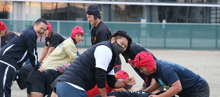 石巻工業高校ラグビー部に訪問し、練習に参加した菊谷崇氏