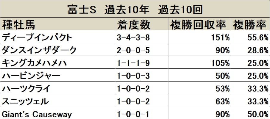 過去10年で最多となる10回の馬券絡みがディープインパクト。次点で3回のキングカメハメハとフジキセキが続き、2回がダンスインザダーク、キングヘイローとなっている。