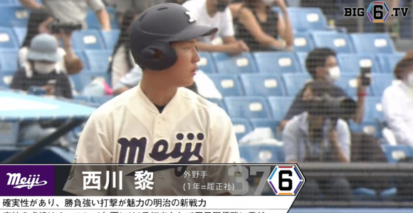 1年生から主力として活躍を続ける明大・西川黎(①履正社)。2試合で計3安打2打点と早くもチームに欠かせない選手へと成長。…