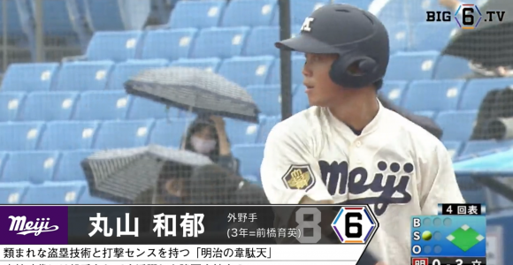 甲子園で1大会8盗塁の最多タイ記録を持つ明大・丸山和郁(③前橋育英)。今日の試合では2安打3打点の活躍。2安打はいずれもスリーベースと持ち前の足で塁を駆け回った!