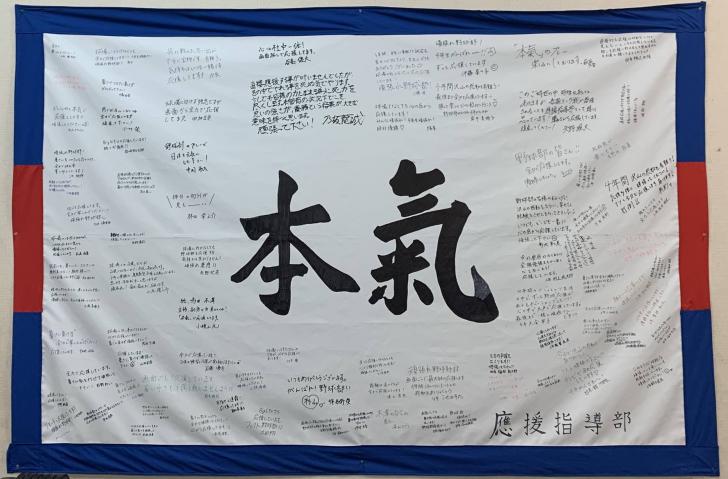 2位に甘んじた今春のリーグ戦。球場に入れない応援団からデッカい横断幕が贈られ、ふだんはトレーニングルームに飾られている。堀井監督は「勝利の思いを込めて贈ってもらったもの。毎日見て、勇気をもらっている。いいプレーで、勝つことで、その思いに応えていきたい」とV奪回への決意を口にした。