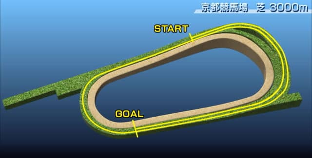 京都競馬場の芝には内回りと外回りがあり、Aコース使用時の一周距離は内:1782.8m、外:1894.3m。ゴール前直線は内:328.4m、外:403.7m。コンパクトな内回りと瞬発力が生かせる外回りコースでは求められる適性が異なってくる点にまずは注意したい。京都芝コース最大の特徴は、外回りで高低差4.3mにもおよぶ3コーナーの「坂」。向正面の半ばから3コーナーにかけて上り、4コーナーにかけて一気に下るレイアウトで、それ以外はほぼ平坦になっている。
