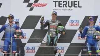 MotoGP第12戦テルエルGPの表彰台。フランコ・モルビデッリ(中央)が優勝を飾った 明暗がはっきりと分かれたレースだ…