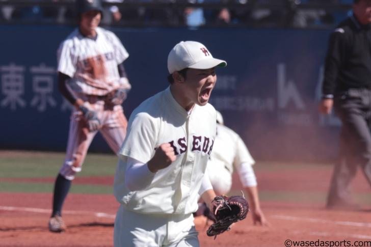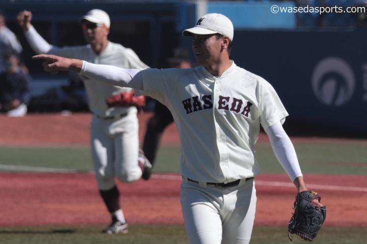 すると3回以降は出塁こそするが、得点に結び付かない苦しい展開に。5、6回は先頭打者が出塁したが、前日の試合と同様に『あと一本』が足りない場面が続く。打線は中川颯(4年)、宮海土(2年)の継投を前に完全に打ちあぐねてしまったのだ。すると7回、早大側にこの日最大のピンチが訪れる。3番手の山下拓馬(法3=埼玉・早大本庄)が連打を浴び、1死二、三塁の場面で打席には山田。ここで力を発揮したのは山下の方だった。変化球を織り交ぜ簡単に追い込むと、勢いのある高めの直球を振らせて空振り三振に切って取る。捕手の岩本久重(スポ3=大阪桐蔭)も手元で小さくガッツポーズを見せた。2死になり、続く打者は現在打率ランキング1位の竹葉章人(4年)。長打力はないが、コンタクトが優れている打者だけに、慎重な配球がバッテリーには引き続き求められた。変化球で追い込むと、4球目に投じたのは外角低めへのチェンジアップ。ここで竹葉が姿勢を崩しながらも食らい付き、ライナー性の打球は三遊間を抜くかと思われた。すると熊田が横っ飛び、ダイレクトで捕球する大ファインプレーを見せた。「とにかく打球をイメージしながら毎球毎球準備をしている」(熊田)との言葉通り、見事な反応を見せて最大のピンチを乗り切った。8、9回は柴田迅(社4=東京・早大学院)が4奪三振と完璧な投球を見せ、試合を締めくくった。