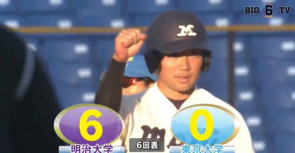 明大は打線の勢いが止まらず大量得点で勝利を掴んだ。ドラフト1位右腕・入江は6回無失点6奪三振の好投で今季3勝目。
