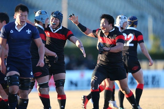 前半からスクラムとFWの密集戦で上回っていた成蹊大にとっては、自信のある地域でのラストチャンス。固まりとなって押し込み、反則を誘ってはジリジリとトライラインに迫る。最後はNO8清水挙がボールをインゴールに押さえた。