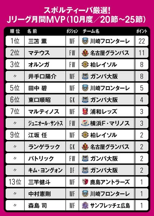 三笘は選考した5名全員からポイントがつき、22ポイントはここまで月間MVP選考をやってきた4回のなかで最高点。途中出場のジョーカー的な役割から、先発出場を増やした10月も変わらぬ鋭いドリブルを見せ、川崎の首位独走に貢献した。
