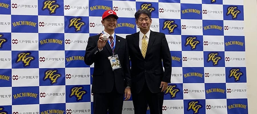 10月26日のドラフト会議で広島から3位指名を受けた八戸学院大・大道温貴投手が6日、大学内で担当スカウトから指名挨拶を受けた。