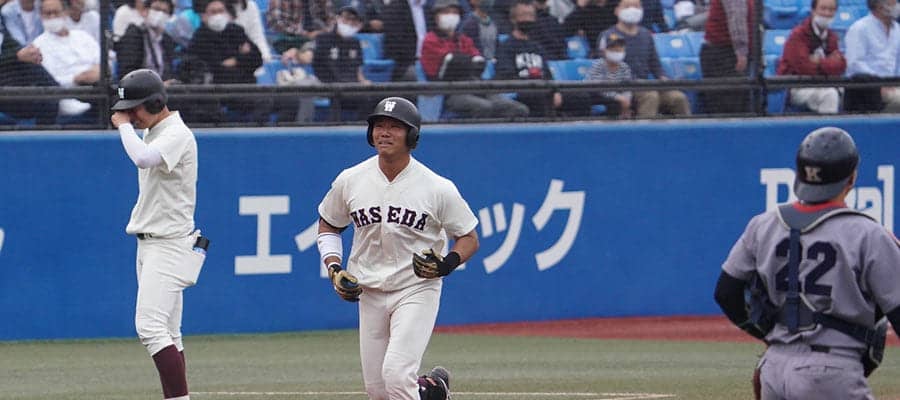 白球がバックスクリーンに着弾するのを見届けると、胸が熱くなった。蛭間は歩みを進めるごとに視界がゆがんでいく。三塁コーチャーの学生コーチ・杉浦啓斗(4年)も涙で後輩を迎える。三塁ベースを蹴った2年生はホーム寸前でもう目元を押さえ、涙でホームイン。さらにベンチ前に飛び出して出迎えた選手たちの目にも光るものが……。揺れる神宮に早大ナインの歓喜の声がこだました。