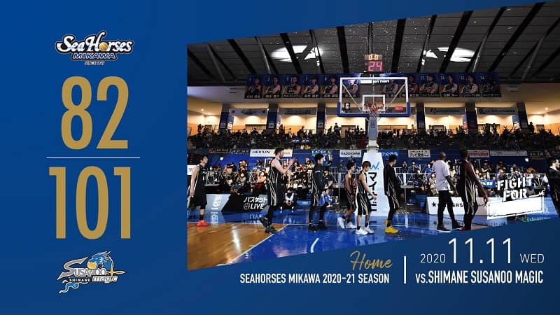 11月11日(水)、島根スサノオマジックをホーム・ウィングアリーナ刈谷に迎えたシーホース三河。前半はディフェンスからペースを作りリードして終えるが、第3Qは島根に主導権を奪われ21点差をつけられる。第4Q、高橋、長野、ガードナーらが積極的に攻め意地を見せたが、点差を詰めることができず破れた。
