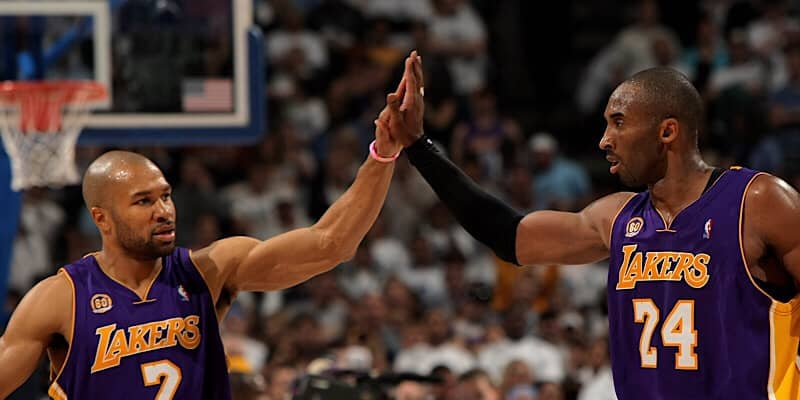 長年コービー(右)とプレーし、ともに5回の優勝を果たしたフィッシャー(左)[写真]=Getty Images