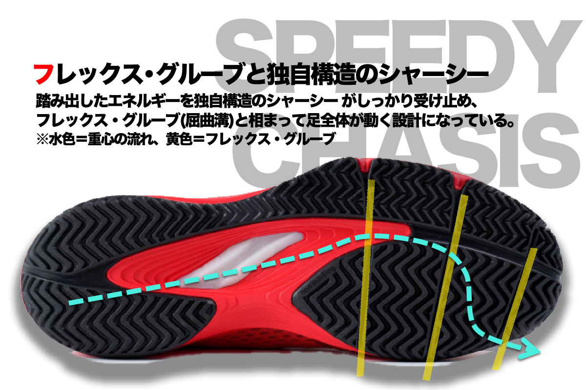 その動き出しと共に連動するのが、アウトソールのフレックス・グルーブと独自構造のシャーシー(シャンク)である。フレックス・グルーブとは、屈曲溝のこと。前足部に3本横に入ったフレックス・グルーブが、蹴り出しをスムーズにし、独自構造のシャンクによって足全体が動く設計となっている。だから、一歩目の動き出しが早いのだ。