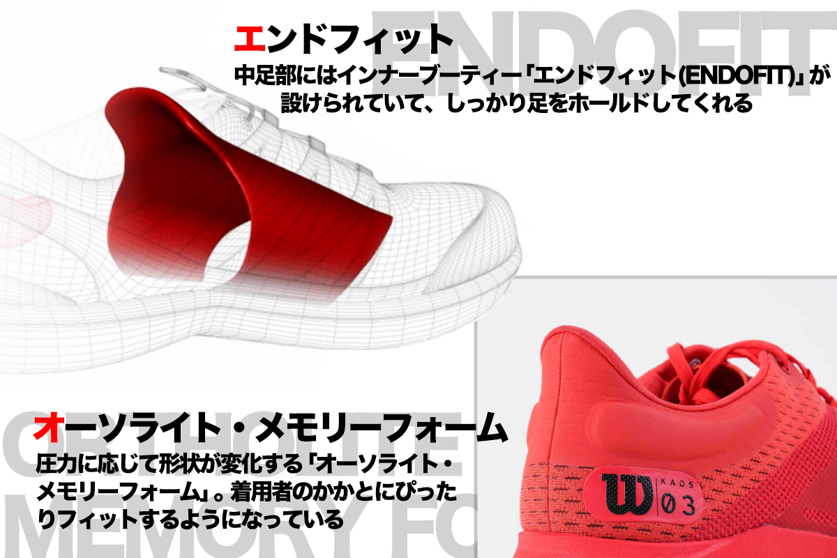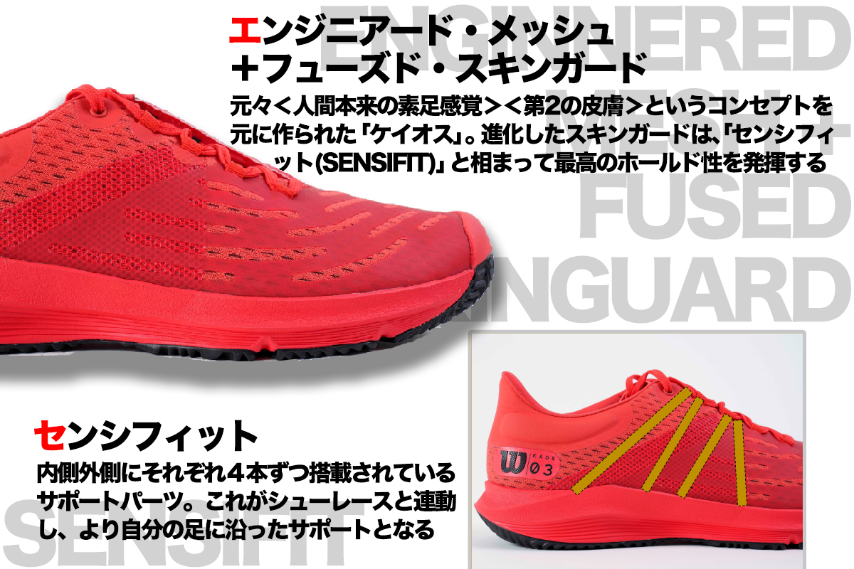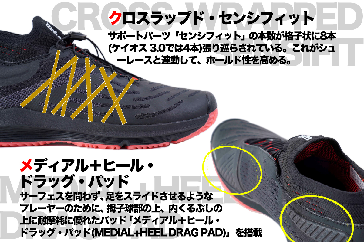 違いは、まずセンシフィットの本数が格子状に8本(ケイオス 3.0では4本)張り巡らされた「クロスラップド・センシフィット(CROSS-WRAPPED SENSIFIT)」が一つ。これが、足のホールド性をさらに高めてくれる。また、サーフェスを問わず、足をスライドさせるようなプレーヤーのために、拇子球部の上、内くるぶしの上に耐摩耗に優れたパッド「メディアル+ヒール・ドラッグ・パッド(MEDIAL+HEEL DRAG PAD)」を搭載している。