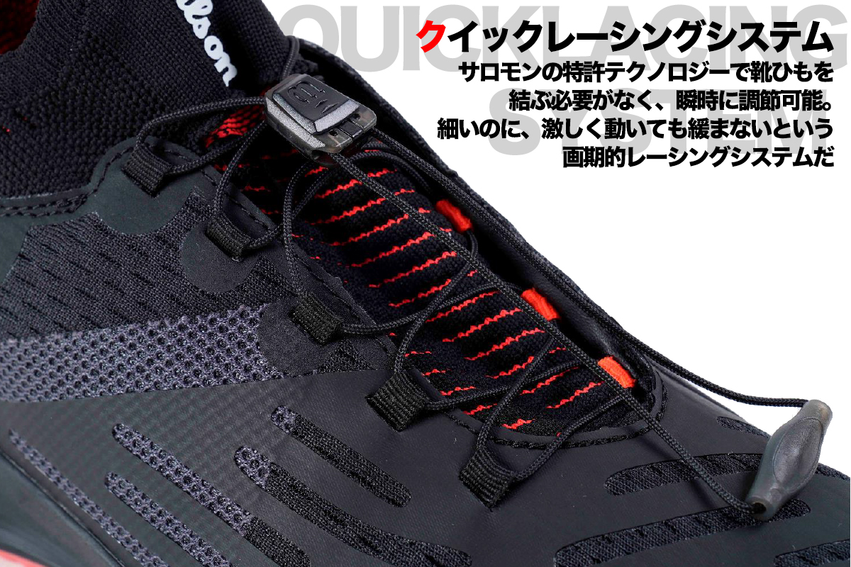 最大の注目は、「クイックレーシングシステム(QUICKLACING SYSTEM )」の採用だ。これはサロモンの特許テクノロジーで、靴ひもを結ぶ必要がなく、瞬時に調節可能。細いのに、激しく動いても緩まないと言うのだから、ぜひ試してみたいテクノロジーである。