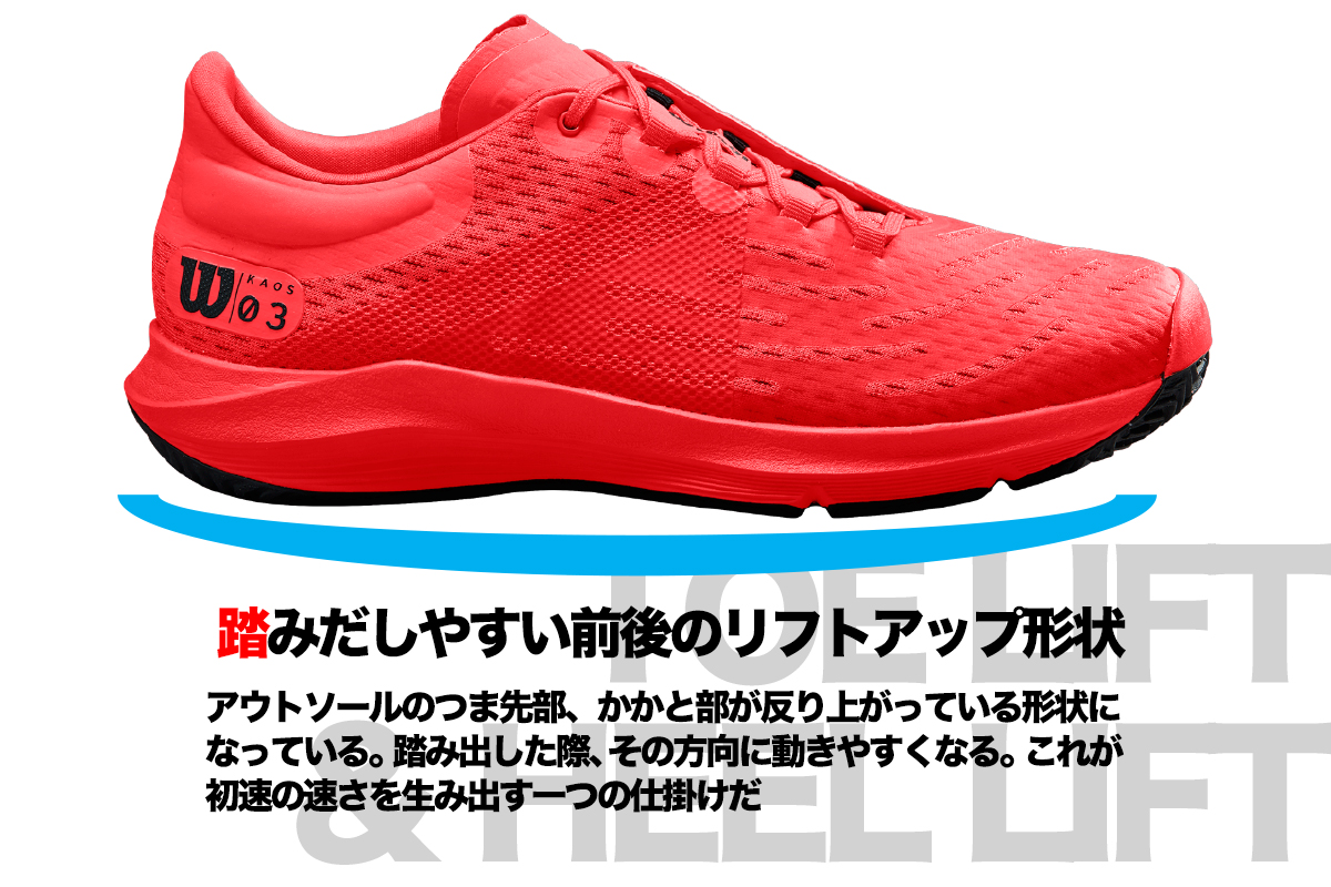 重要なのは2つのテクロジーだ。一つが「トゥ・リフト&ヒール・リフト」で、アウトソールのつま先部、かかと部が反り上がっている形状になっている。他のスポーツと比較した場合、テニスが特徴的なのは360度方向に動くということ。その踏み出し時に、加速させる役目を担っているのが、このテクノロジーである。