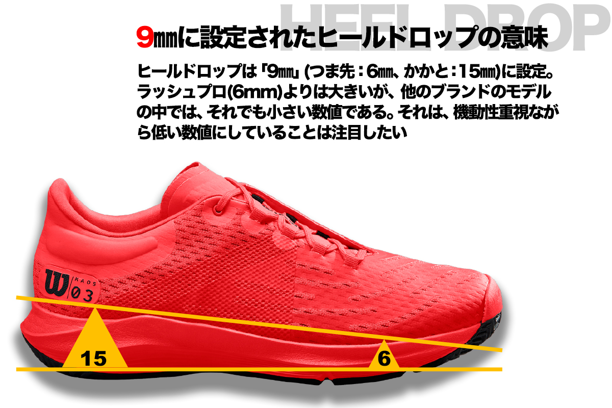 先ほどヒールドロップの話をしたが、最新の「ケイオス」では、9mm(つま先:6mm、かかと:15mm)となっている。ラッシュプロの6mmよりは大きいが、他のブランドのモデルの中では、それでも小さい数値である。機動性重視のモデルなのに、なぜ小さいのか? 安全性を保つためである。