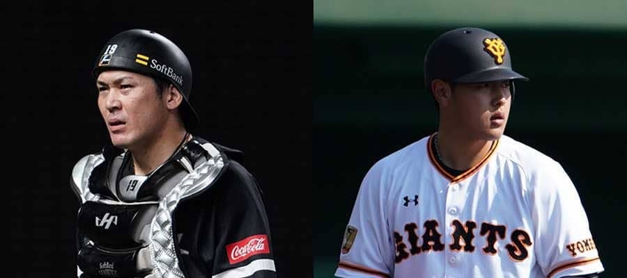 ソフトバンク・甲斐拓也(左)と巨人・岡本和真【写真:荒川祐史】
