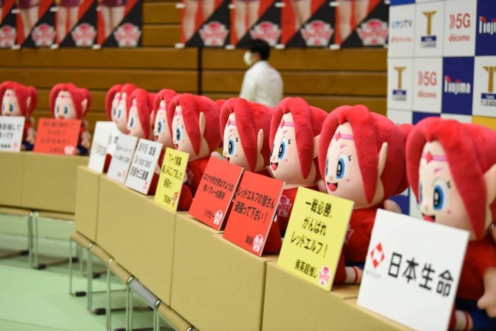 写真:日本生命レッドエルフはTリーグの無観客開催に伴い、チームマスコットのエルフィーがファンからの応援メッセージを掲げる/提供:©T.LEAGUE