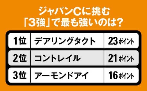 「ジャパンCに挑む『3強』のうち、最も強いのは(or勝つのは)どの馬か?」というアンケートを識者9名に実施し、本誌競馬班からも1名参加。それぞれに1位~3位まで順位づけしてもらい、1位の馬を3点、2位の馬を2点、3位の馬を1点という形で集計。その合計ポイントによって、順位を決定した。