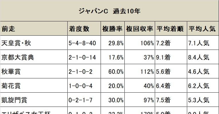 29日に東京競馬場で行われるジャパンカップ(3歳上・GI・芝2400m)について、前走・ローテーション別に検証してい…