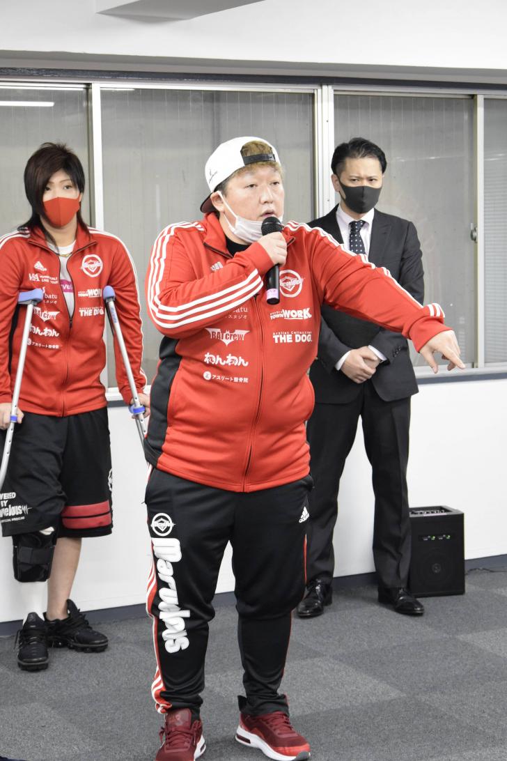 初めにGAEAISM PROJECTの運営事務局長である中島氏から、新型コロナウイルスの影響で2020年4月15日に予定されていたGAEAISMの興行が、2021年4月29日(祝)に開催されることが発表された。なお開催場所が後楽園ホールから大田区総合体育館に変更。現在観客がチケットを保管している枚数が約1,000枚。会場収容率(50%)が来年も継続された場合、後楽園ホール(約750名)には収容しきれないため、会場が大田区総合体育館へ変更になった。