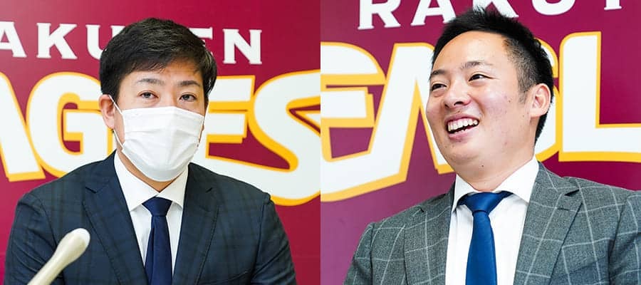会見に臨んだ楽天・牧田和久(左)と松井裕樹【写真提供:楽天野球団】