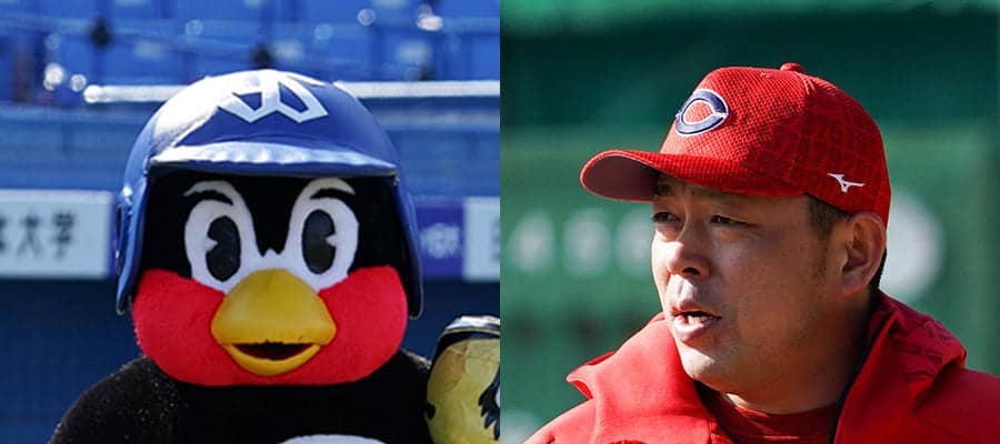 ヤクルト・つば九郎(左)と現役引退した広島・石原慶幸【写真:荒川祐史】