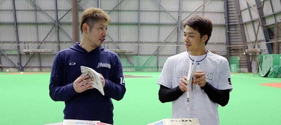 集めた本を手に取る日本ハム・中島卓也(右)と加藤貴之【写真提供:北海道日本ハムファイターズ】
