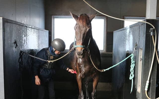 研修生たちは騎乗訓練を終えると、それぞれ騎乗馬の馬装を解き、洗い場に繋いでお湯で汗を洗い流す。丁寧に水分を拭き取り、馬服を着せて馬房に戻し、次の騎乗馬の準備に入る。何人かに「騎乗訓練は寒いですか?」と質問すると、みんな同じように「寒いです」と元気よく答えてくれた。本州、とりわけ関東以西から来ている研修生にとっては、この日の気温はさぞ辛いものであろう。だが、気温1度はまだ序の口で、年明けには、終日気温がプラスにならない「真冬日」になる日も珍しくない。これからは寒さとの闘いでもある。