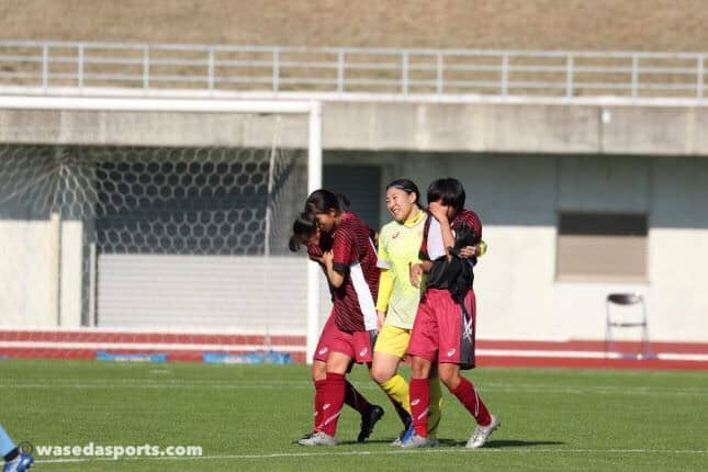 まずは1点を奪いたい後半、早大ベンチはMF松本茉奈加(スポ4=東京・十文字)に代えてMF三谷和華奈(スポ1=東京・十文字)を投入。再三狙われていた左サイドの守備を補強するのではなく、攻撃で押し返そうという、福田あや監督(平20卒)らしさを感じさせる選手交代であった。その起用に応え、49分、MF村上真帆(スポ4=東京・十文字)のハーフウェーライン付近からのロングパスに三谷が反応。スピードに乗ったドリブルで相手ゴールに迫った。しかし、普段戦っている相手とは格が違うのがこの日の相手。抜け出す直前で足が伸び、突破を許さない。するとその直後、入ったばかりの三谷が負傷。わずか10分ほどの出場で、交代を余儀なくされてしまった。しかし、流れを掴んだら話さないのが早大。その後もDF堀内璃子(スポ1=宮城・常盤木学園)が負傷するなど随所で苦戦を強いられたが、ベンチを含めたチーム一丸となって対応。関東大学女子リーグ筑波大戦(●0-1)以降取り組んできたチーム構築の成果を感じさせた。その後も攻め続け、着実に相手ゴールに近づいていく早大。前がかりになった分、相手に裏を狙われるシーンも増えたが、後藤が完璧に対応し、最終ラインからもチームに流れを引き寄せる。だがゴールは奪えず、このまま試合終了かと思われた。しかし90+2分、高い位置でのボール奪取からFW廣澤真穂(スポ2=ノジマステラ神奈川相模原ドゥーエ)のスルーパスにFW高橋雛(社2=兵庫・日ノ本学園)が抜け出すと、PA内で倒されPKを獲得。このPKを自ら沈め、土壇場で同点に追いついた。