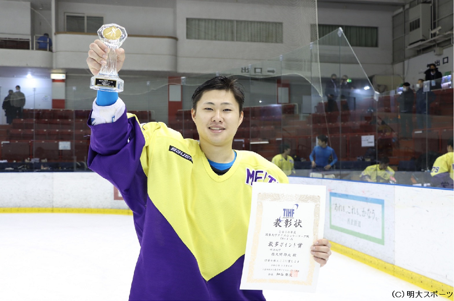 関東大学リーグ戦3位という結果に終わり、順位としては目標には一歩及ばなかった今大会。そんな中でも、3年生ながら名実ともに明大のエースとしてチームを引っ張った佐久間が、大会ポイント王に輝いた。チームの勝利、そして何よりも引退していく4年生のことを一番に考える男は、タイトルについて「うれしさはない」と語った。しかし「(佐久間に)助けられたシーズンだった」(徳田)と、その熱い思いは十分チームメイトに伝わっている。