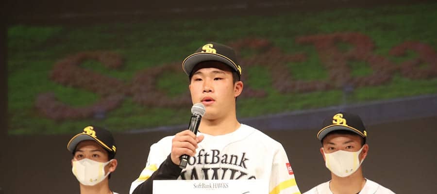 ソフトバンクは10日、本拠地PayPayドームに隣接する「BOSS E・ZO FUKUOKA」内にある「よしもと福岡 大和証券/CONNECT劇場」で新入団選手発表会見を行った。ドラフトで指名された支配下5人、育成8人がお披露目され、各選手の背番号も決まった。