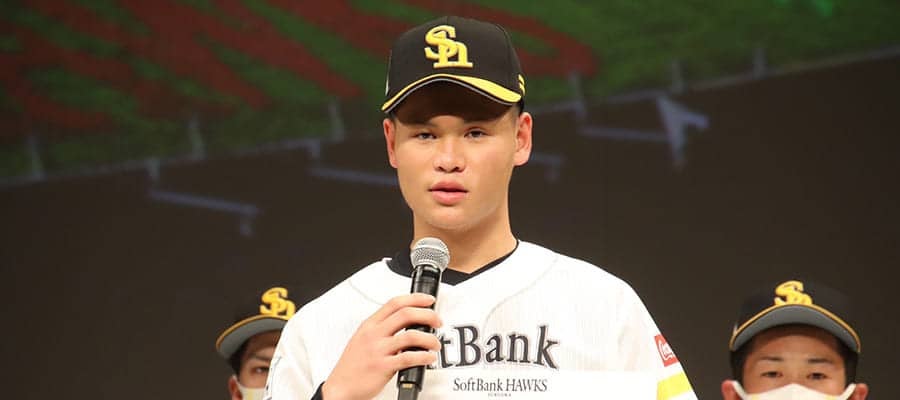 ソフトバンクは10日、本拠地PayPayドームに隣接する「BOSS E・ZO FUKUOKA」内にある「よしもと福岡 大和証券/CONNECT劇場」で新入団選手発表会見を行った。ドラフトで指名された支配下5人、育成8人がお披露目され、各選手の背番号も決まった。
