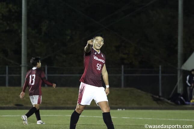 迎えた関東大学リーグ戦(リーグ戦)第21節、リーグ8位と下降気味の筑波大との一戦が行われた。前半に、両肩の手術を経て前節から復帰したFW奥田陽琉(スポ1=柏レイソルU18)が流れを引き寄せる先制点を奪い、早慶戦で同点ゴールを決めたMF西堂久俊(スポ2=千葉・市立船橋)が2点目を追加した。後半開始早々にも西堂のゴールでが生まれ、相手を突き放した早大。押し込まれる場面もあったが、3-1で勝ち点3をものにした。