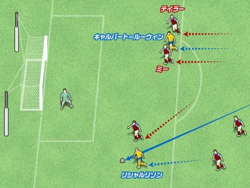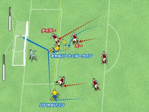 リシャルリソンの位置によっては、ファーで合わせる形を選択していただろう。だがその場合、手前でクリアされる可能性は十分にある。ここでは相手の前に入れるチャンスがあったので、それを逃さなかった。キャルバート=ルーウィンが得点を量産する理由がわかるシーンだった。