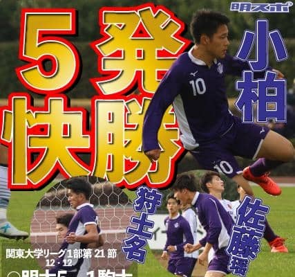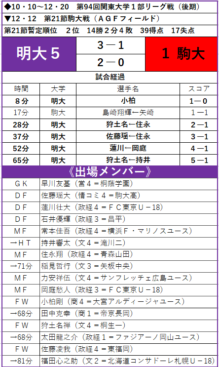 第21節の相手は、約1ヶ月ぶりにリーグ戦に復帰した駒大。優勝のために勝利が欲しい一戦は、前半から3点を奪取し優位な展開に。後半にも追加点を挙げ、相手を突き放した明大が快勝。首位・早大との勝ち点差は、ついにゼロとなった。