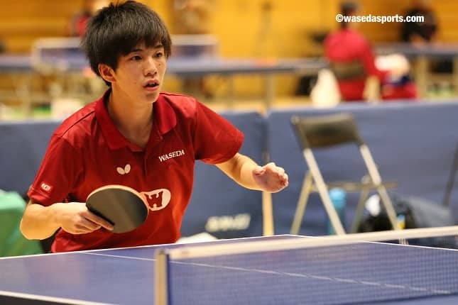 その中で6回戦まで進出したのが川上尚也(スポ3=静岡学園)と岩永宜久(スポ2=福島・帝京安積)の2選手だ。主将の五十嵐史弥(スポ3=石川・遊学館)がけがの影響で棄権したことで、今大会でのエース格としての期待がかかっていた川上。スーパーシード(4回戦からのシード)から、4回戦、5回戦をともにストレート勝ちで制すなど順調な滑り出しを見せた。しかし、6回戦で「相手をしっかりと見れていなかった」と左利きの中央大の浅津(2年)相手にまさかのストレート負けを喫し、ベスト32で敗退。今大会での収穫は「ない」と言い切るなど、早大の主力選手としての悔しさをにじませた。一方の岩永は、「しっかりと振り切ることができた」と要所での粘りが光り、4,5回戦での接戦をものにする。しかし、6回戦では法大・佐藤(3年)のバックハンドを主体とする攻めに対応できずにストレート負け。共にチーム内では気を吐いたものの、課題を残す結果となった。