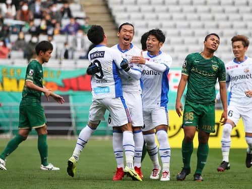 40節の東京ヴェルディ戦で先制ゴールを決めたベテランの角田誠(写真中央)